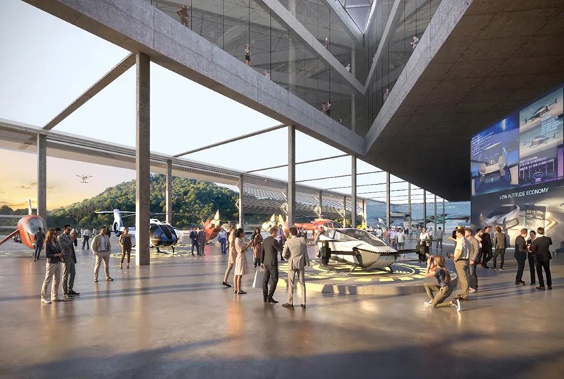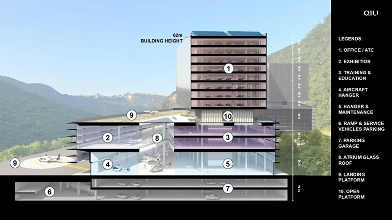 QIU受邀設(shè)計的深圳首個載人無人機(jī)港,將在未來成為大灣區(qū)低空商務(wù)旅行的新總部,兼?zhèn)渚仍行募拔磥黼妱哟怪逼鸾担╡VTOL)測試基地。